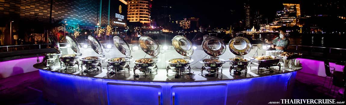Check-in registration typically starts around 7:30 PM (19:30 hrs) at the River City Pier (Siam Commercial Bank Pier 2). The cruise usually departs at 8:30 PM (20:30 hrs).
